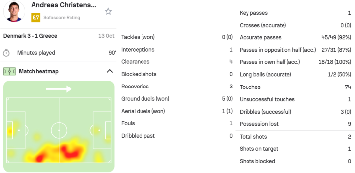 克里斯滕森在这场激战中,2次射门1次精准命中,虽然3次盘带都未能如愿突破,但在防守端,他如同一道坚不可摧的墙,完成了1次拦截和4次解围,还3次从对手脚下夺回球权。全场74次触球,49脚传球中包含1脚关键传球,传球成功率高达92%,真是让人惊叹不已!