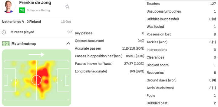 德容,这场比赛他同样首发并打满全场,以7.6分的优异表现证明了自己的实力。