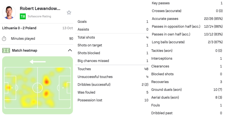 莱万,这场比赛他首发并打满全场,还打入1球,以7.6分的表现征服了所有人。